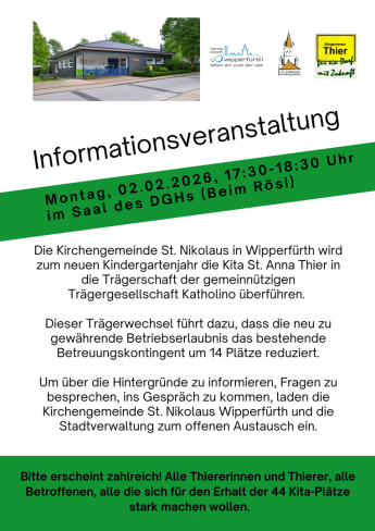 Die Kita St. Anna Thier soll zum 01.08.2026 über einen neuen Träger "Katholino" laufen. Hier muss vom LVR eine neue Betriebserlaubnis ausgesprochen werden. Dafür müssen 14 der 44 Kinderplätze gestrichen werden. Die Mängel, weswegen keine neue Betriebserlaubnis unter vorhandenen Begebenheiten ausgegeben wird, waren schon jahrelang bekannt. Leider wurden sie nicht fristgerecht behoben, sodass jetzt viele Thierer Familien vor der Situation stehen, dass ihre Kinder keinen Betreuungsplatz im Dorf -auch zukünftig nicht- erhalten werden.